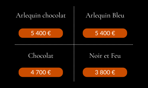 Je travaille le chocolat, l’arlequin chocolat, le noir et feu ainsi que l’arlequin bleu.